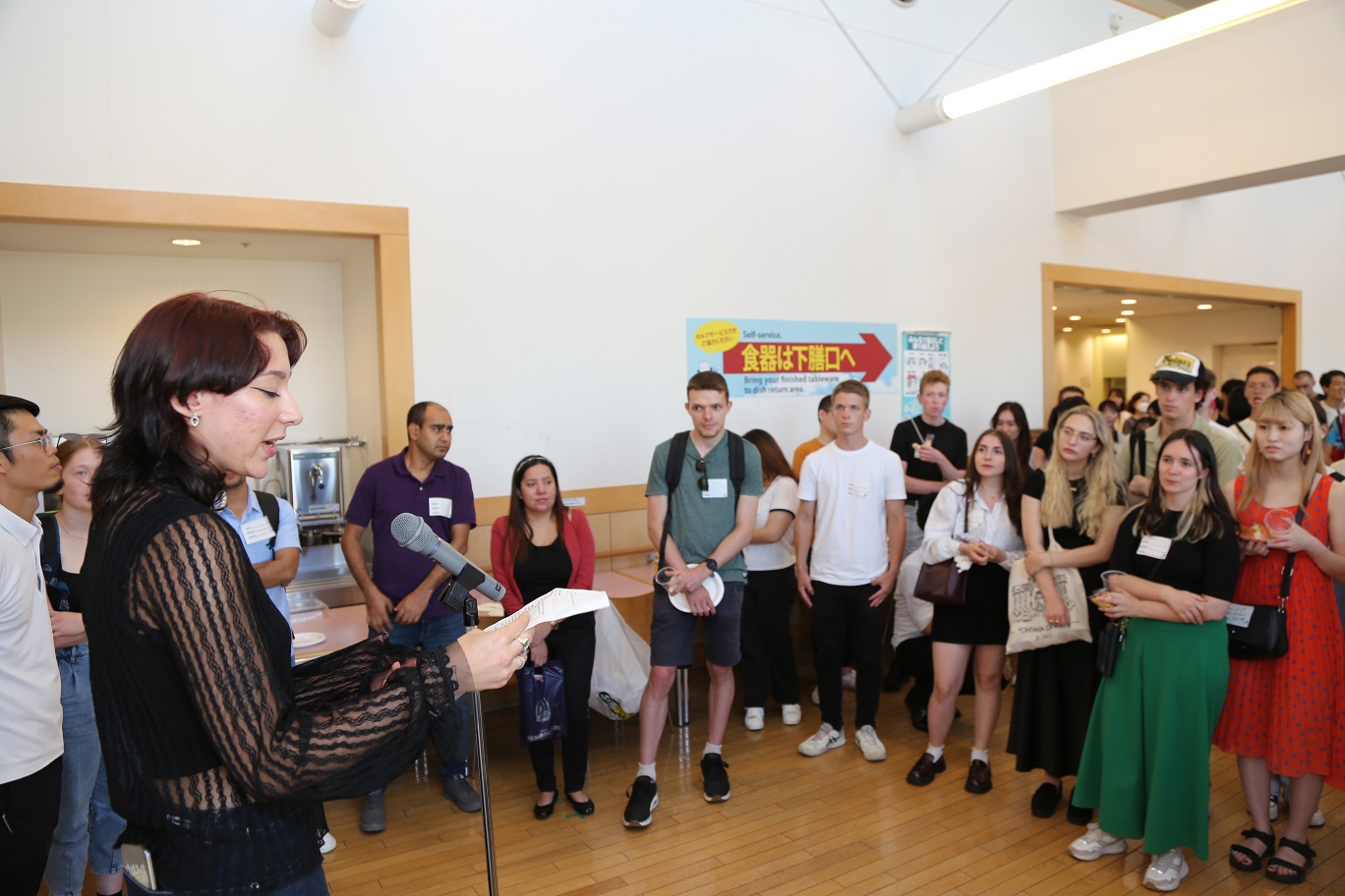 Following the exchange event, the International Student Center hosted a welcome party for new international students. The event commenced with a welcome speech by Mr. Yasuhiro Tokoro, Vice Director of Meiji University International Student Center, followed by a toast. Participants enjoyed light snacks and engaged in lively conversations. Conversations among the participants blossomed, numerous small groups formed, and laughter filled the entire room. Students talked to each other about their plans and were overheard to say such things as, "I want to visit Akihabara next time," followed by responses like, "That sounds great, when should we go?" Finally, Ms. Bruno Ambre Rose, an exchange student from Aix-Marseille University (France), delivered a speech on behalf of the international students, that included what she wanted to achieve during her study abroad experience. The gathering concluded on a high note.